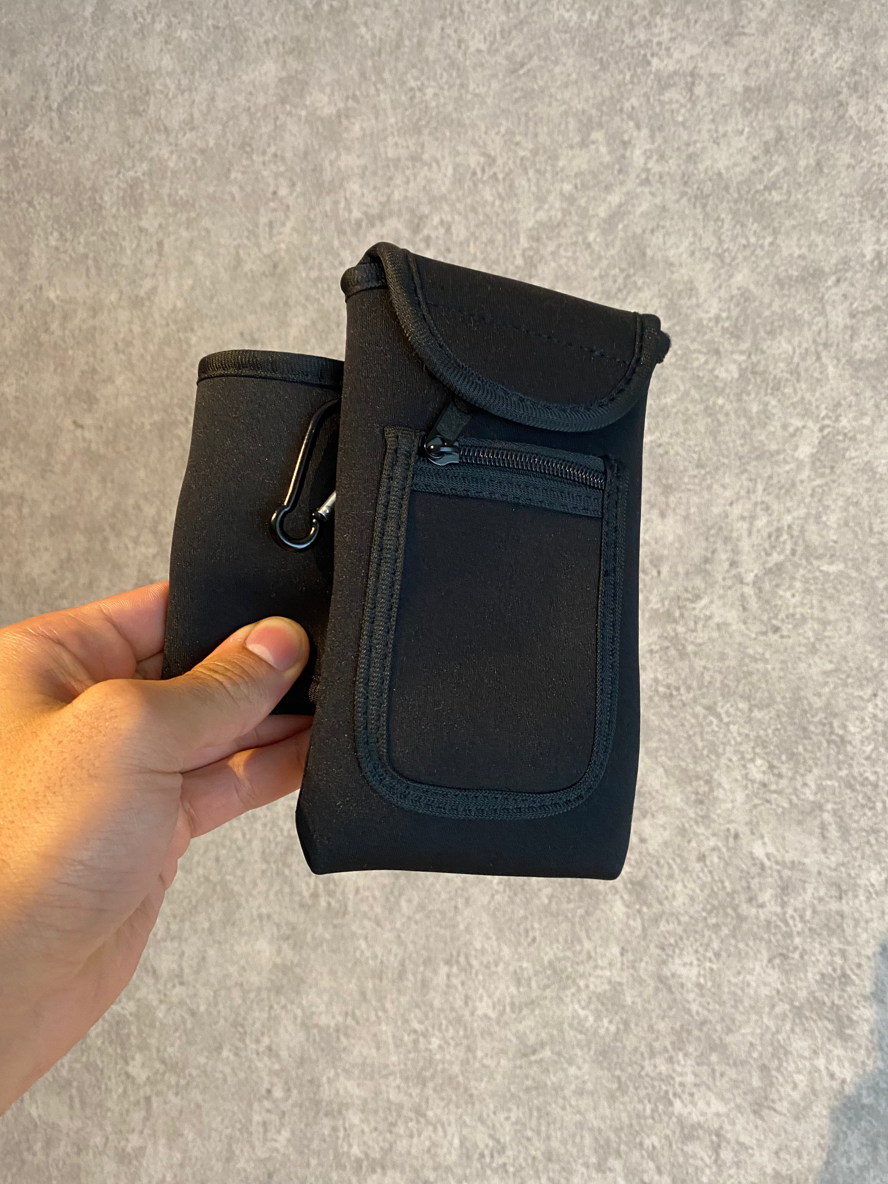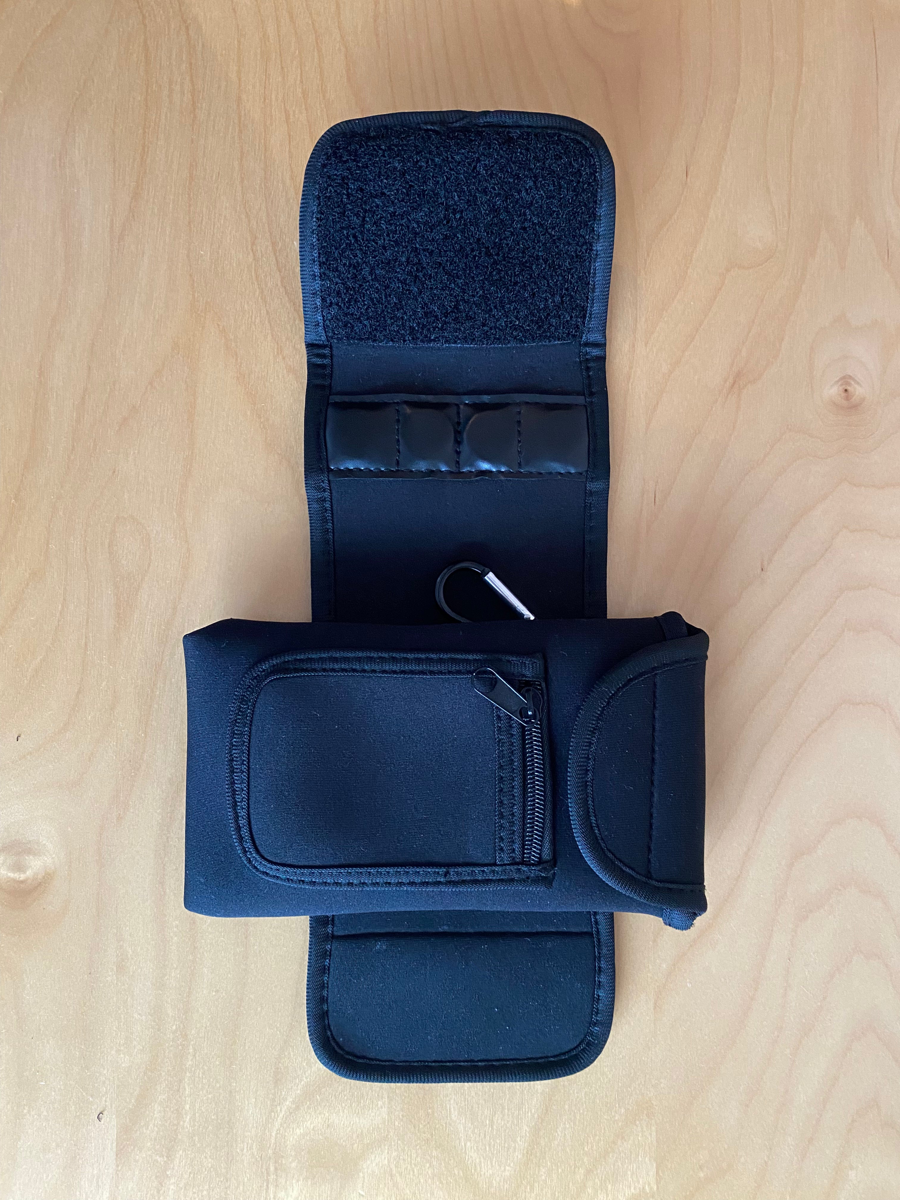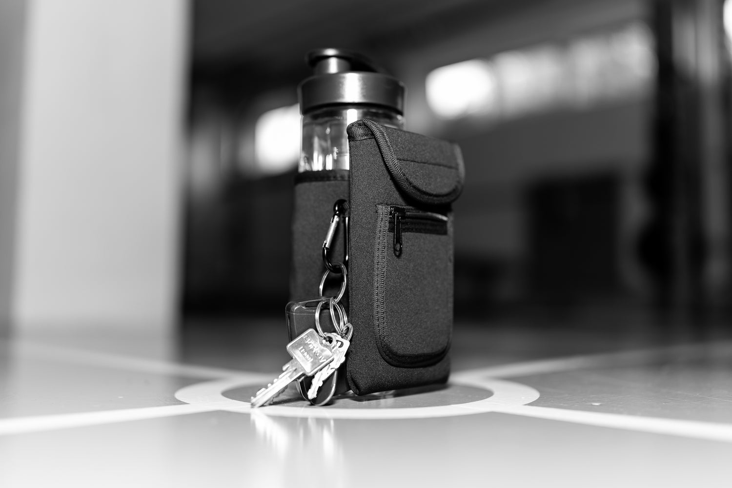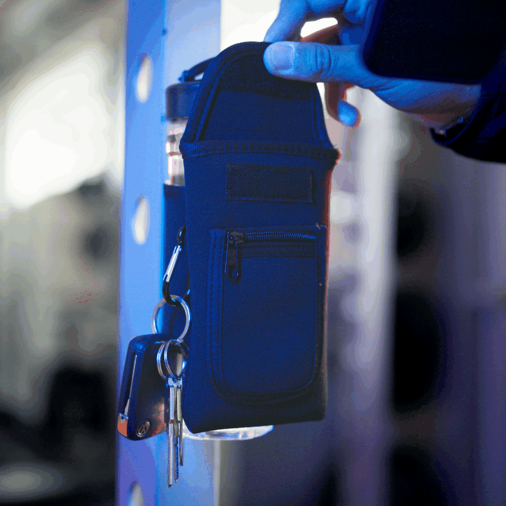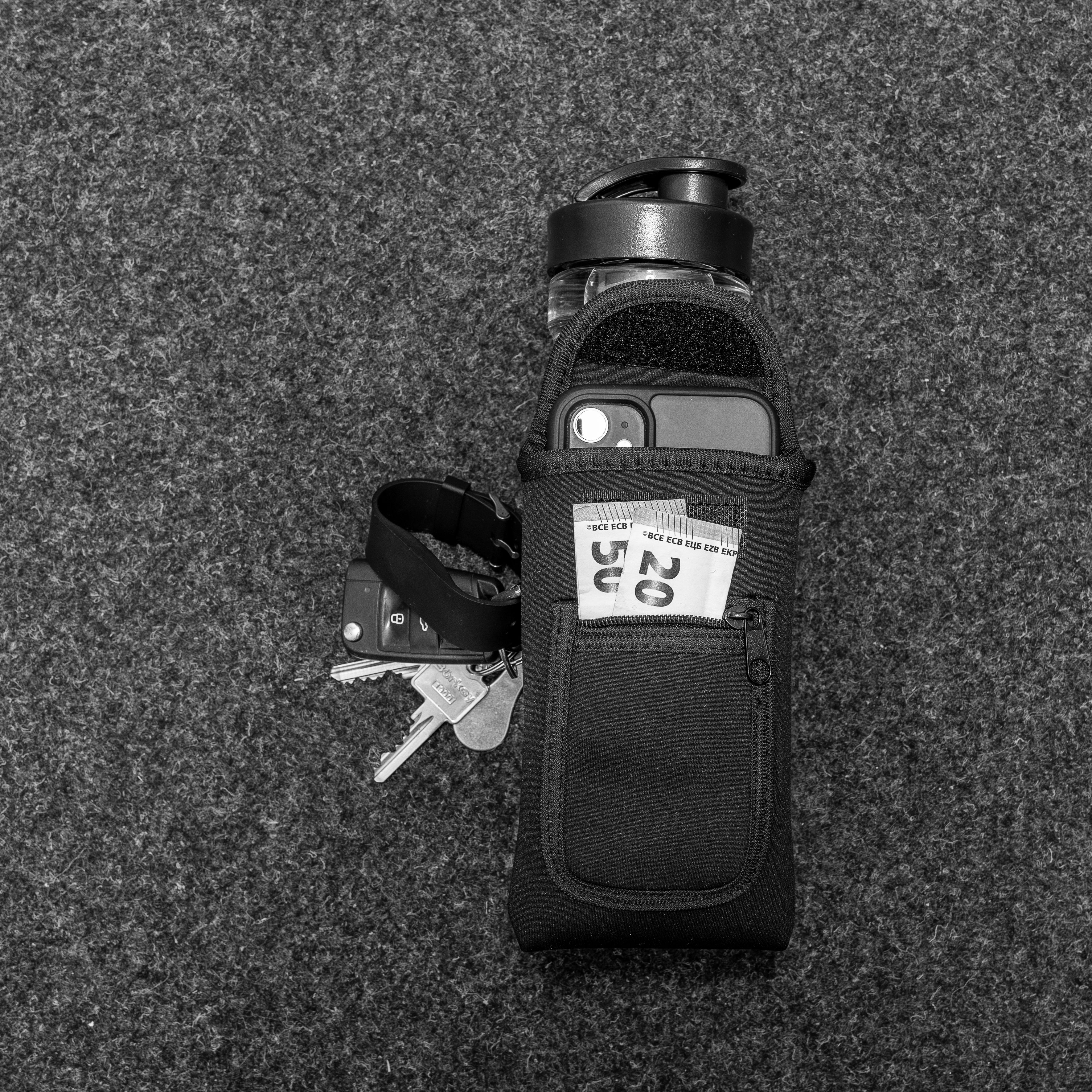 Der Flexentials Gym Organizer ist eine Flaschenhalterung aus Neopren mit integrierten Taschen und magnetischer Rückseite. Er ermöglicht das sichere Mitführen von Smartphone, AirPods, Schlüsseln und weiteren Essentials während des Trainings. Die Halterung ist für gängige Sportwasserflaschen mit einem Durchmesser von ca. 12–40 oz (350–1200 ml) geeignet.
